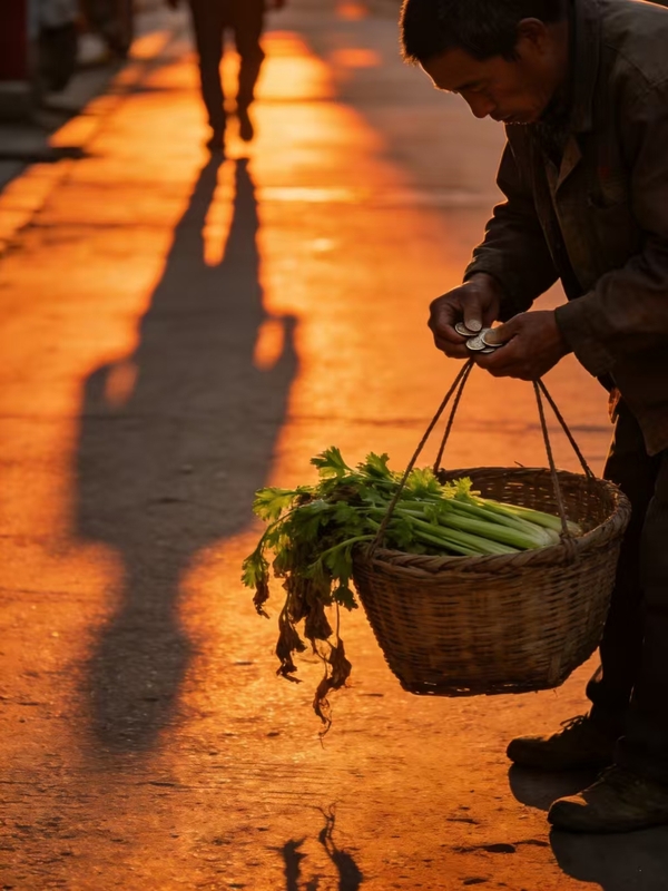 四 黄昏的盘算 夕阳把菜篮的影子,拉得瘦长, 蔫了的芹菜叶,像一封没封口的家书。 他数着掌心所剩无几的硬币, 在心里,反复演算明天的三餐—— 生活,总要在精打细算的缝隙里, 奢侈地,留一把提味的葱。