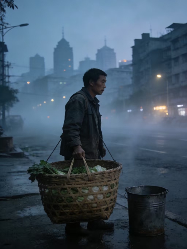 晨光还未揉开城市的眼, 菜篮已跟着他的脚步, 撞响了黎明。 铁皮桶里晃荡的半瓶凉水, 盛着昨夜,没来得及说完的梦。